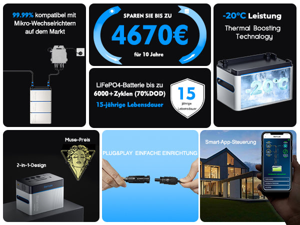 Kein zusätzlicher HUB erforderlich; jede Batterie verfügt über einen integrierten MPPT und BMS, was den unabhängigen Anschluss an Solarmodule und Mikro-Wechselrichter ermöglicht. Sie können auch frei gestapelt und kombiniert verwendet werden.